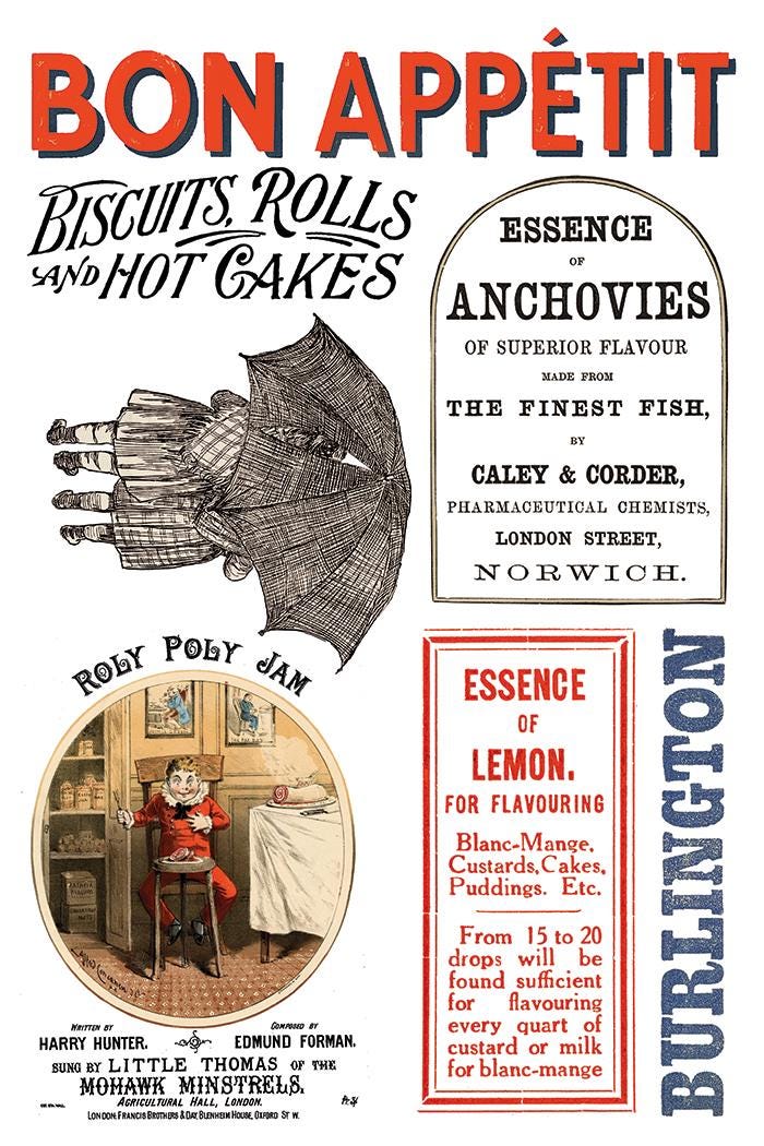 Home Sweet Home is gushing with vintage goodness from the mischievous little “greedy boy” reaching for that roly poly pudding (yep, that’s a real vintage ad! 🤩) to the intricate Imperial Granum label. It’s essentially like rummaging through an early 1900s pantry in the best way possible.